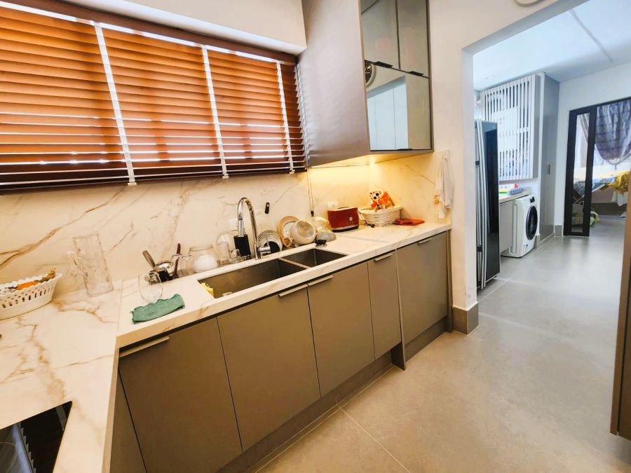 - Living integrado à cozinha, com luz natural abundante;
