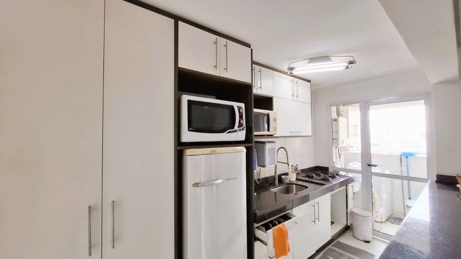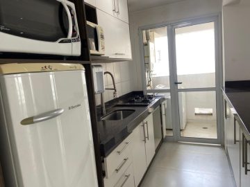Ambientes amplos e iluminados com cozinha americana planejada, armários embutidos, área de serviço funcional e varanda aconchegante.