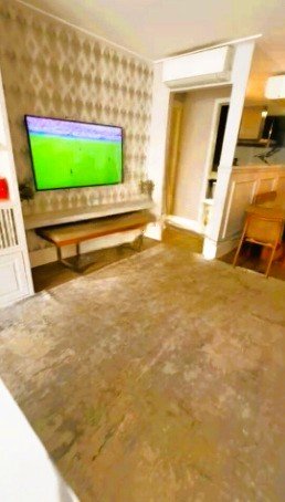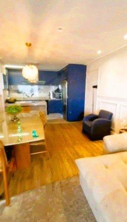 Ampla sala de estar com piso de madeira, ideal para criar ambientes acolhedores e sofisticados;
