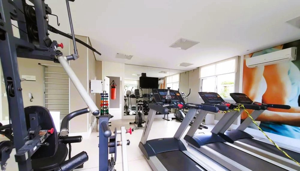 Academia equipada, sala de ginástica e pista de cooper;